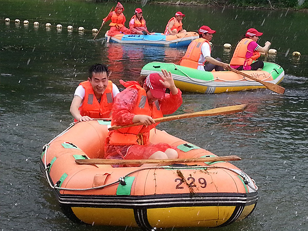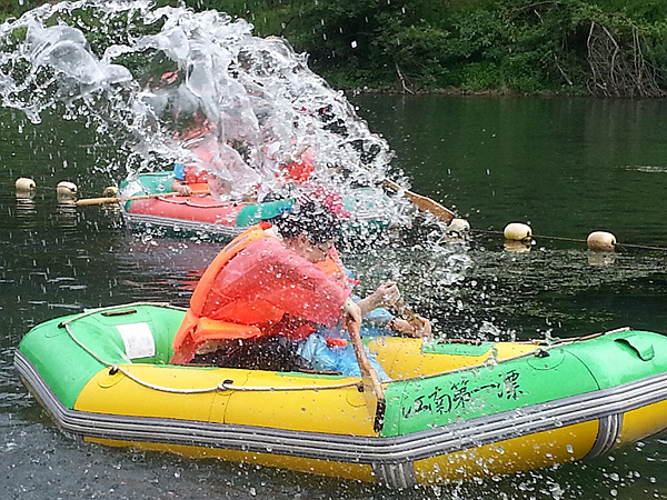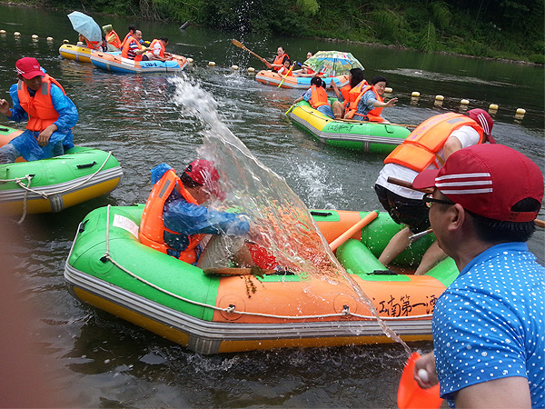 首先我们来到了闻名全国的“江南第一漂”(月亮湾漂流),带上水枪,穿上救生衣、乘坐橡皮艇,漂流正式上演。亲近炫丽自然,体验刺激漂流,尽管衣服全部湿透,也挡不住大家的激情与活力。